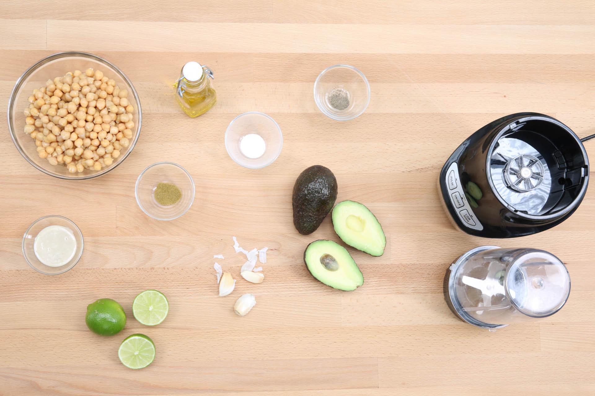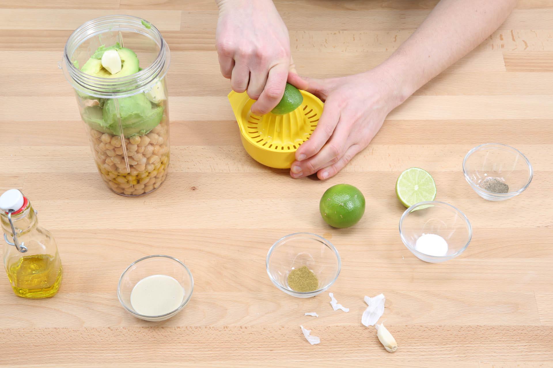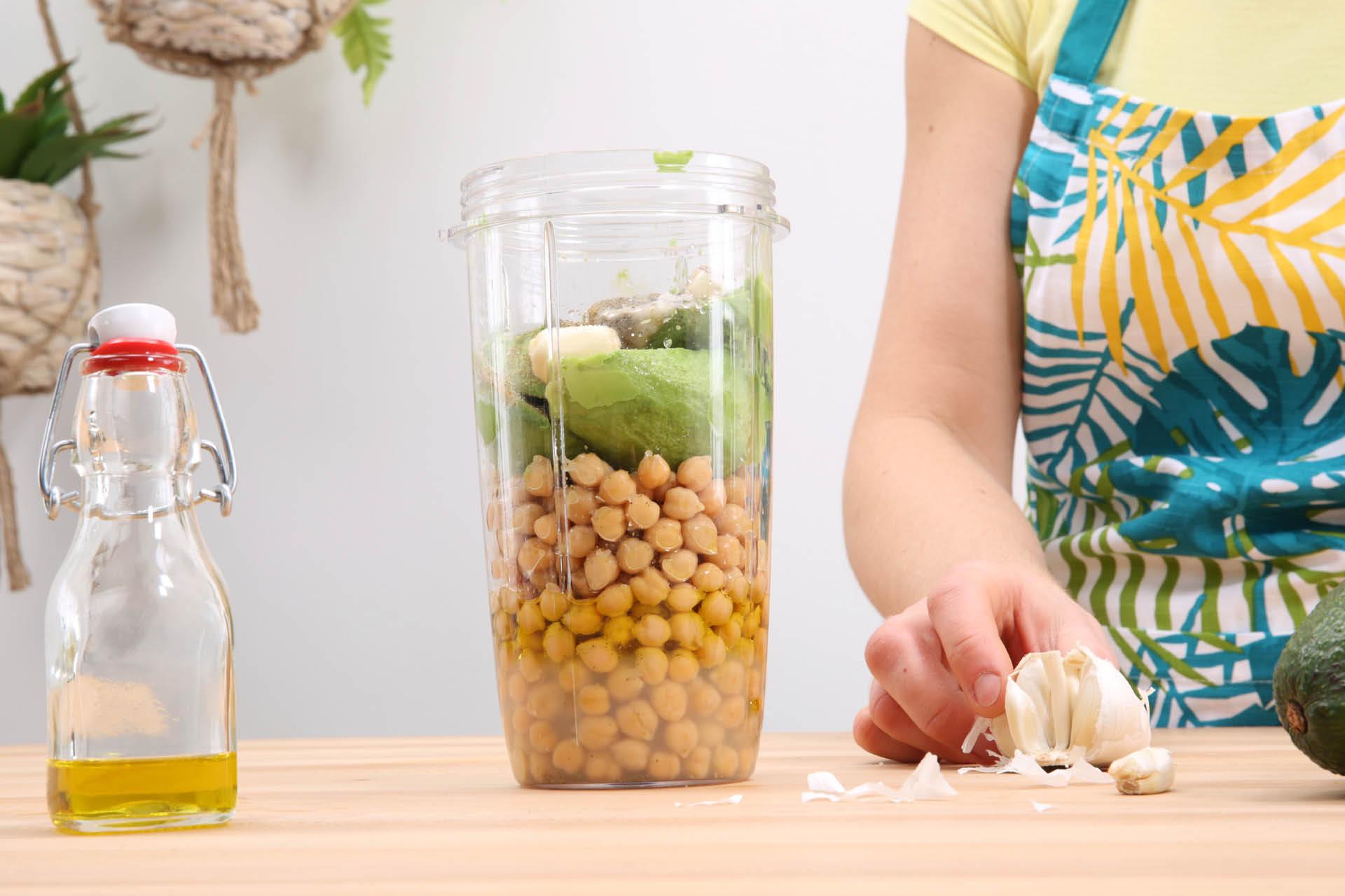 Szedd ki a csicseriborsót a konzervből, öblítsd le és tedd a turmixgépbe. Hámozz meg 2 gerezd fokhagymát és az avokádót, majd facsard ki a lime-ot.