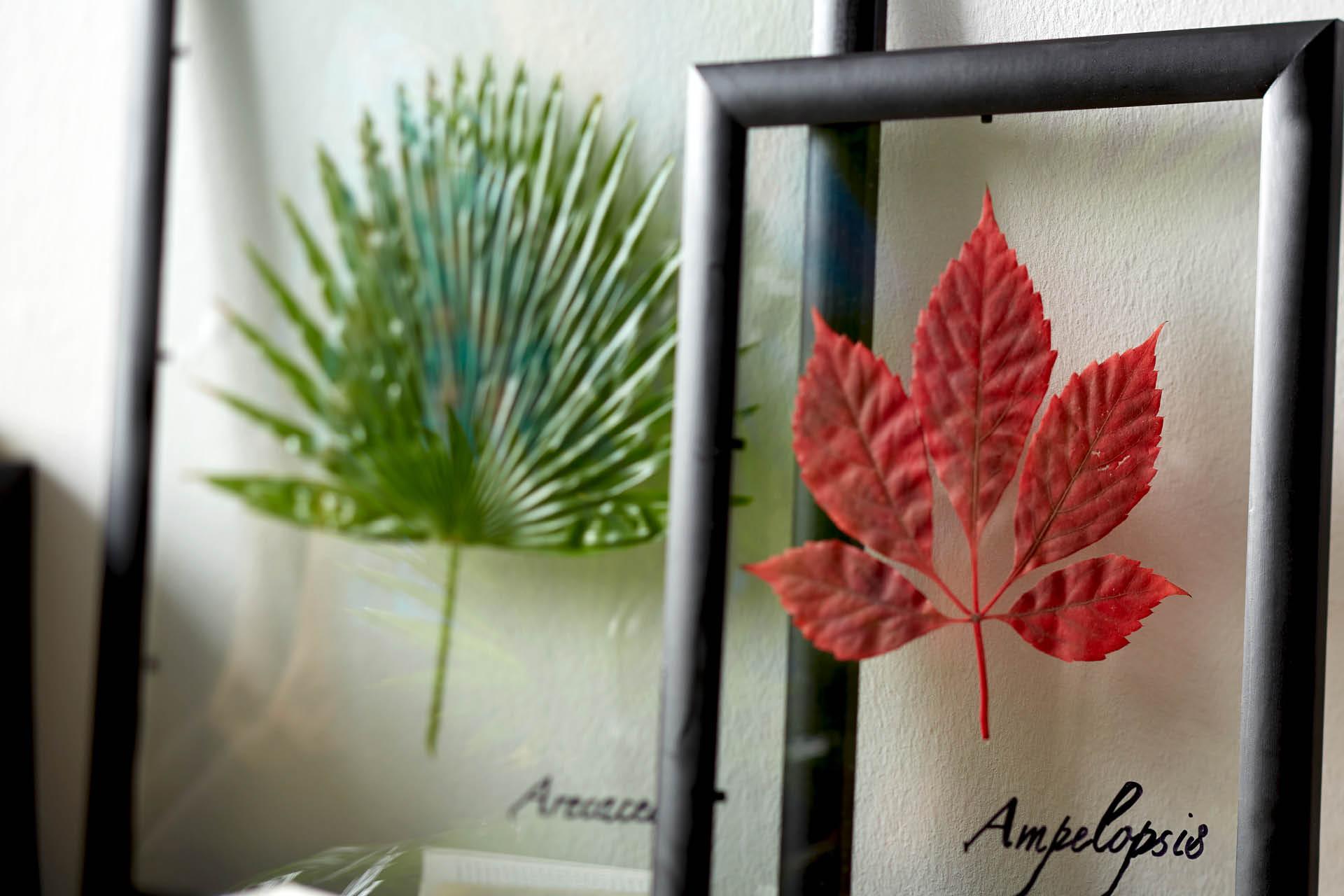 Ha a képkeret már a kívánt színben van, a kiválasztott növényeid megszáradtak és megtisztítottad a két üveglapot, akkor elkezdheted az összeillesztést. Helyezd a szárított növényeket a két üveglap közé. A biztos fixálás érdekében használj átlátszó kétoldalú ragasztót és egy toll vagy akár fogpiszkáló segítségével igazítsd helyére a leveleket. Ha ügyes vagy, ragasztó csak az egyik oldalon látható halványan.